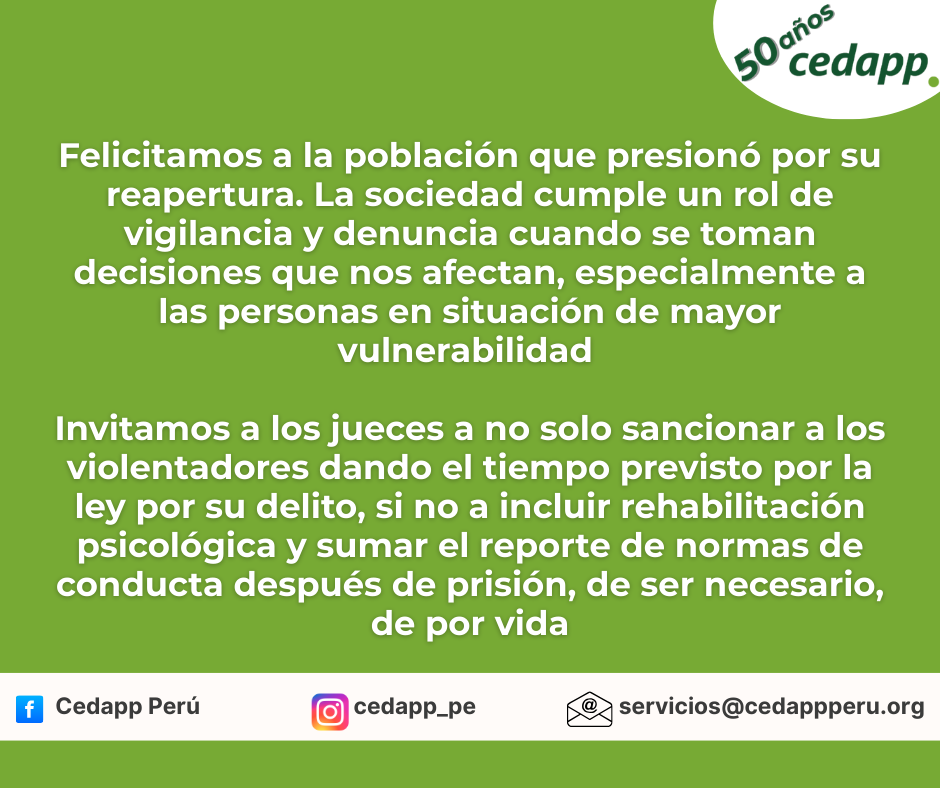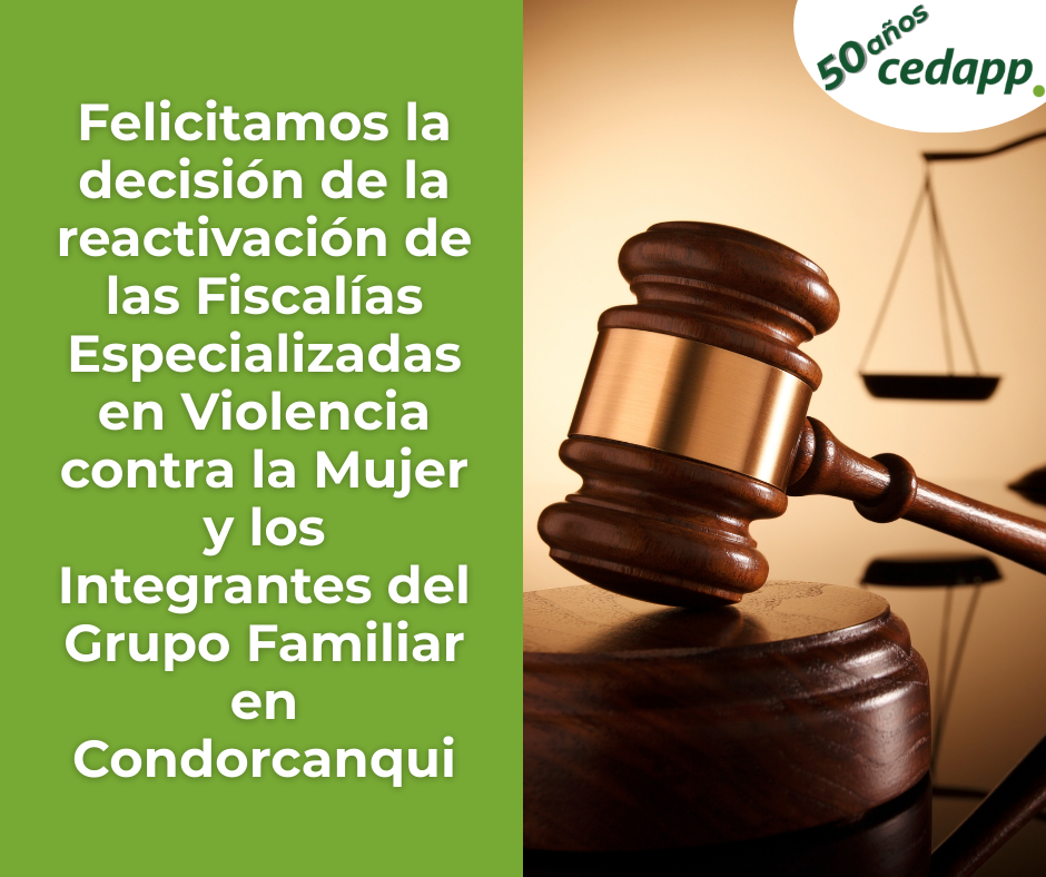 Sobre la reactivación de las Fiscalías Especializadas en Violencia contra la Mujer y los Integrantes del Grupo Familiar en Condorcanqui Deja un comentario / Por CedappAdmin CedappAdmin / 28 de febrero de 2026 Saludamos la decisión de la reactivación de las Fiscalías Especializadas en Violencia contra la Mujer y los Integrantes del Grupo Familiar en Condorcanqui porque la justicia es terapéutica e indispensable para víctimas y victimarios.
